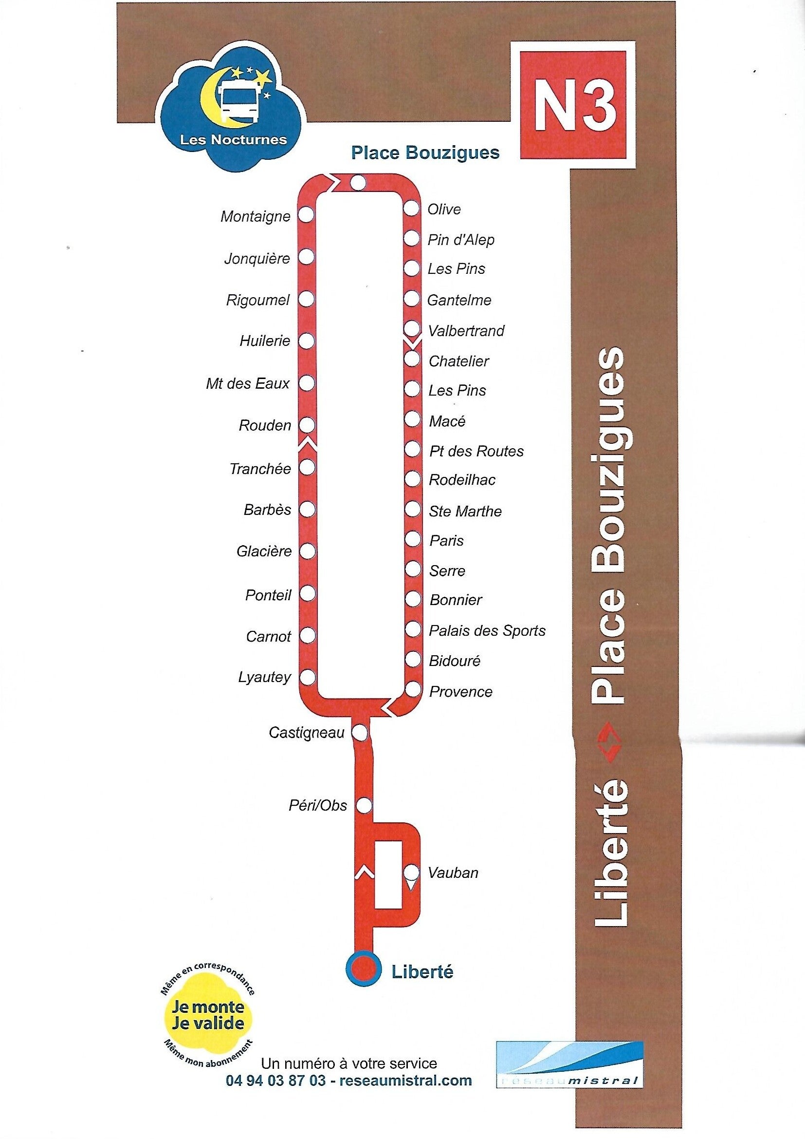 La ligne 3 bénéficie d’un renfort nommé N3* Mini Nocturnes entre Gare & Mourillon de mai à septembre.