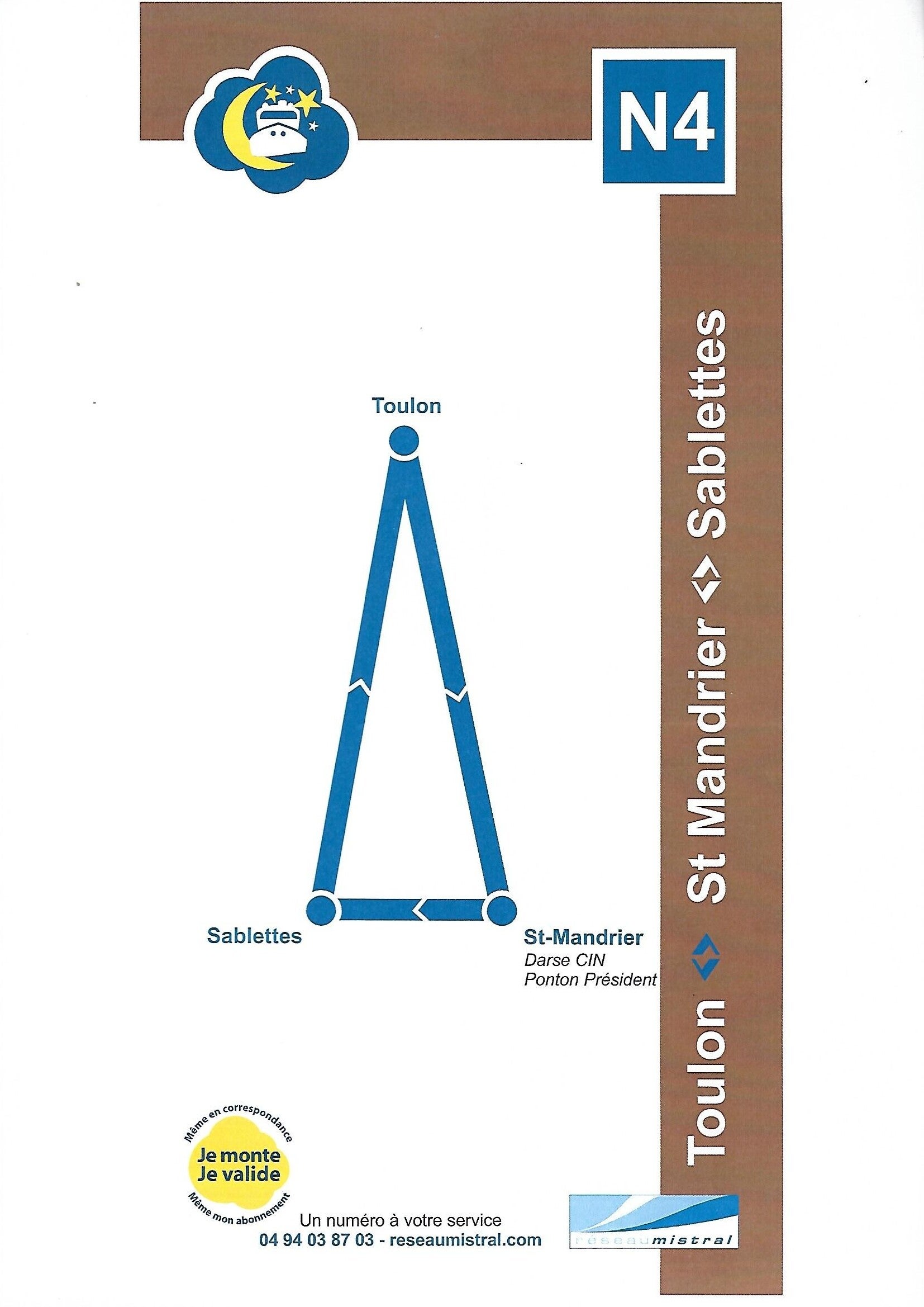 N4 : Ponton Toulon > Ponton CIN a certains voyages > Ponton St Mandrier > Ponton Sablettes > Ponton Toulon (Ligne de Bateau)