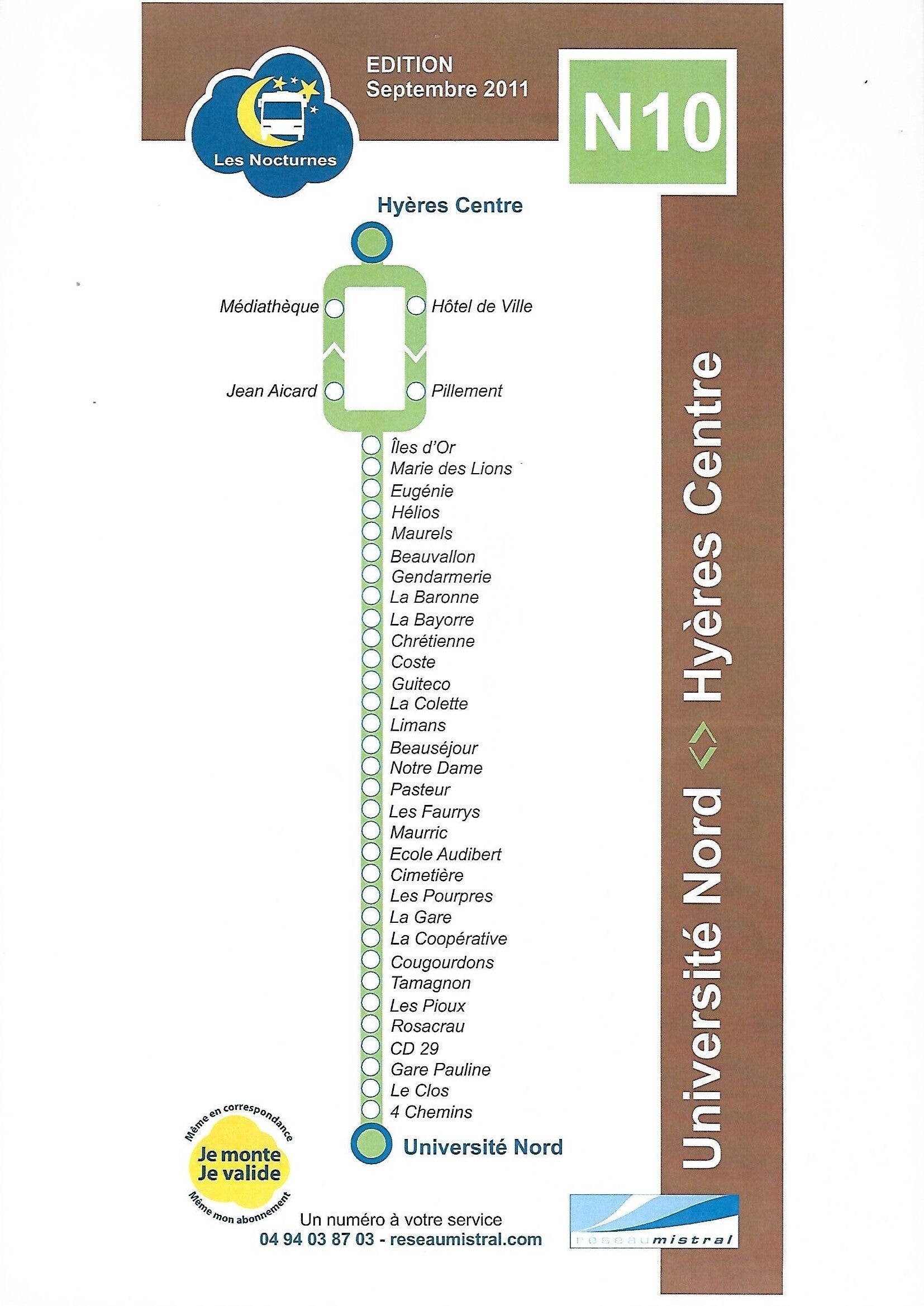 N10 : Université Nord <> Hyères Centre (assurée par la Sodetrav)