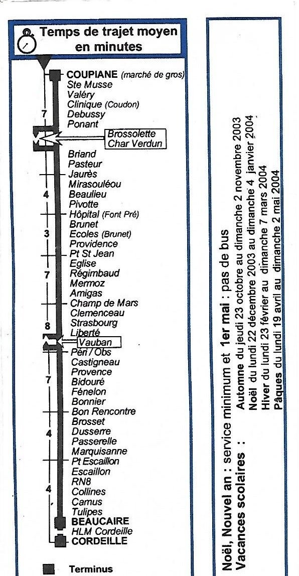 - Depuis la rentrée 2024, la ligne est prolongée à raison d’1 bus sur 2 du lundi au samedi et à tous les départs en nocturnes ainsi que les dimanches & fêtes à Hôpital Ste Musse
