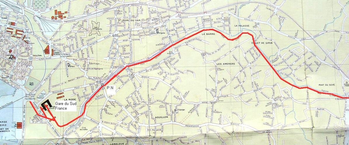 - 1952 : À la suite d’un procès entre les Cars Gaby (qui exploitent l’axe Toulon <> Hyères) et les Chemins de Fer de Provence, la ligne abandonne le littoral entre Toulon & Hyères au profit de la genèse du trajet actuel.