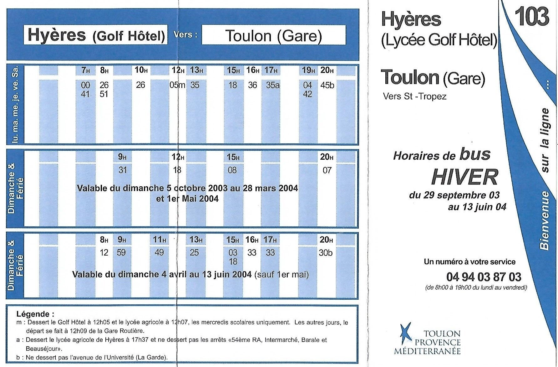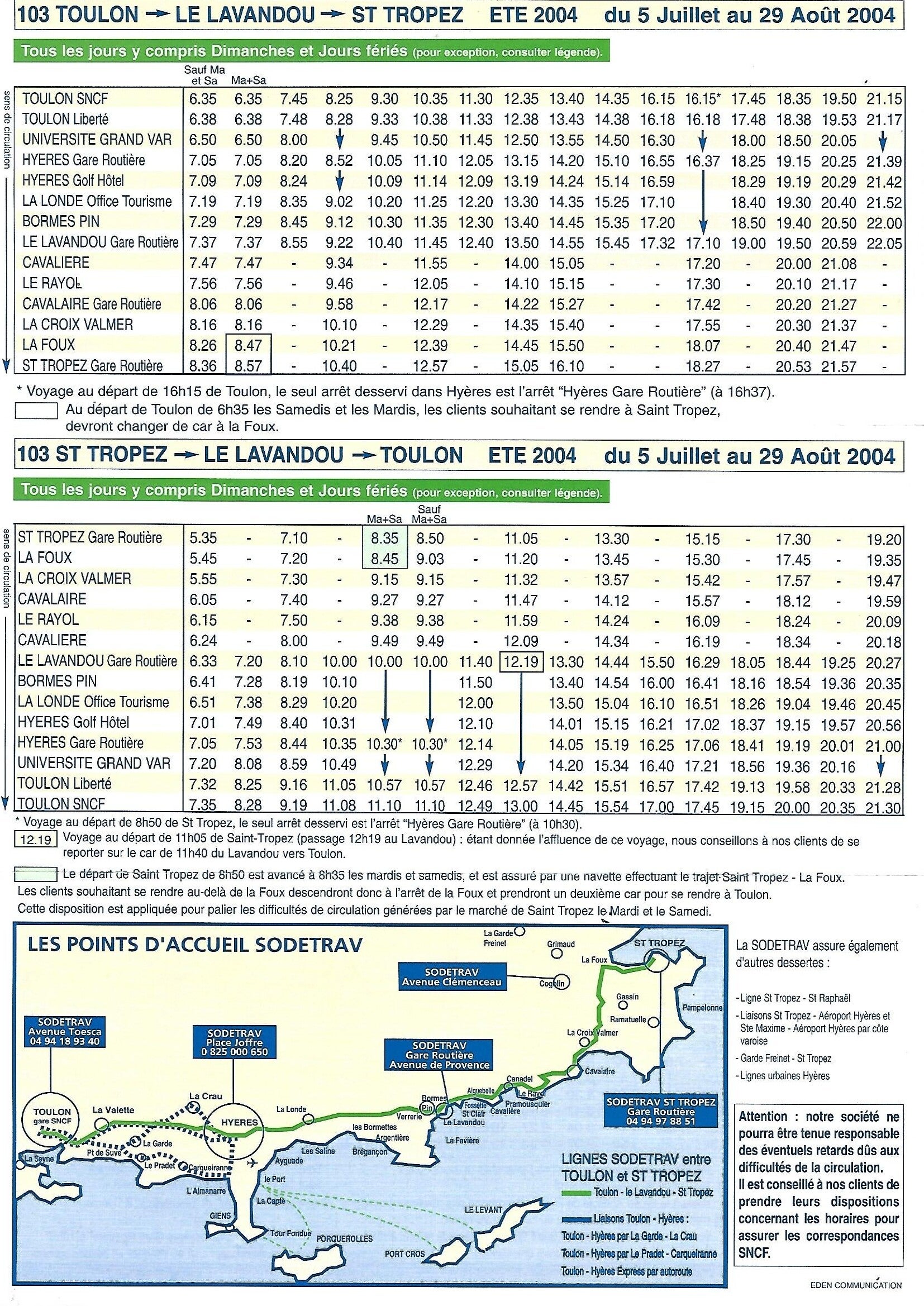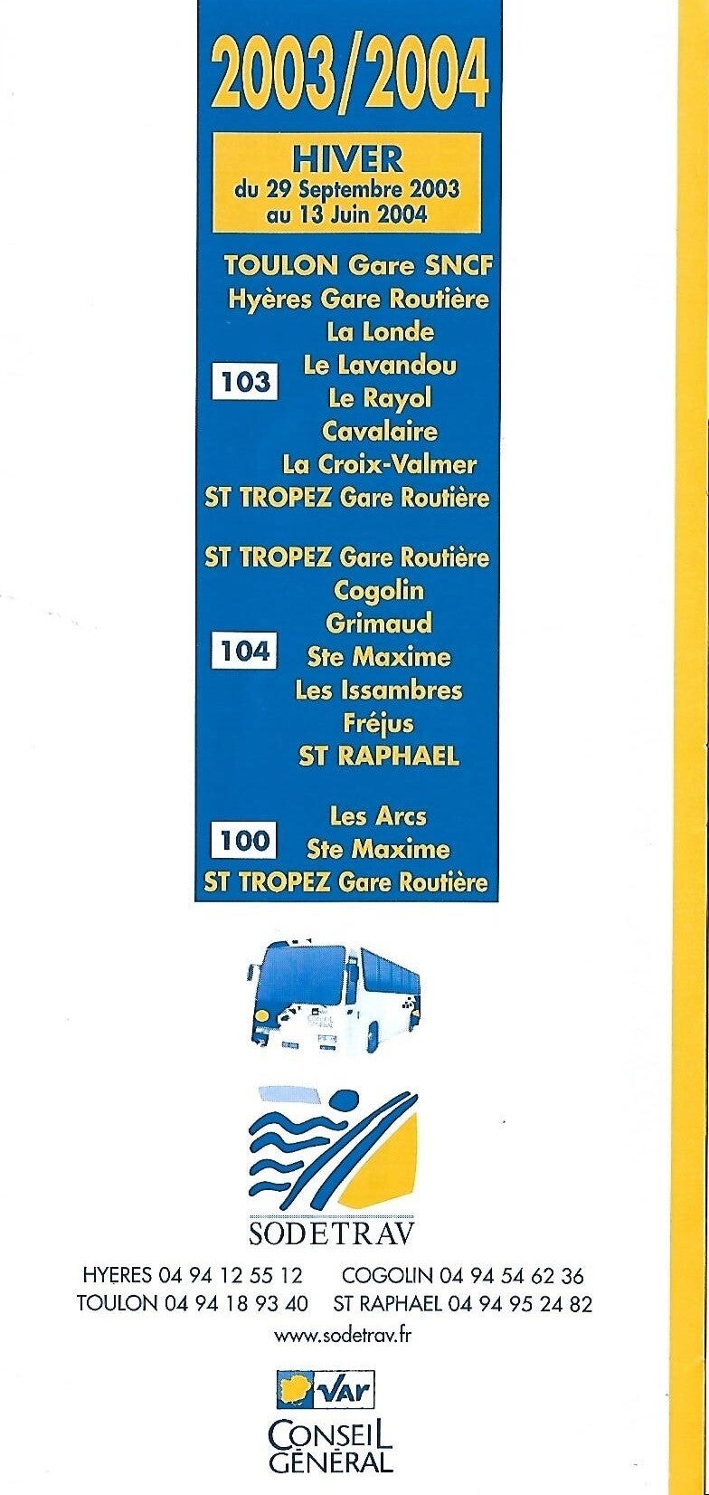 - Septembre 2009 : La ligne 103 est limitée au trajet Toulon <> Hyères que nous connaissons à la suite de la perte du marché par la Sodetrav de l’axe Toulon <> St Tropez.