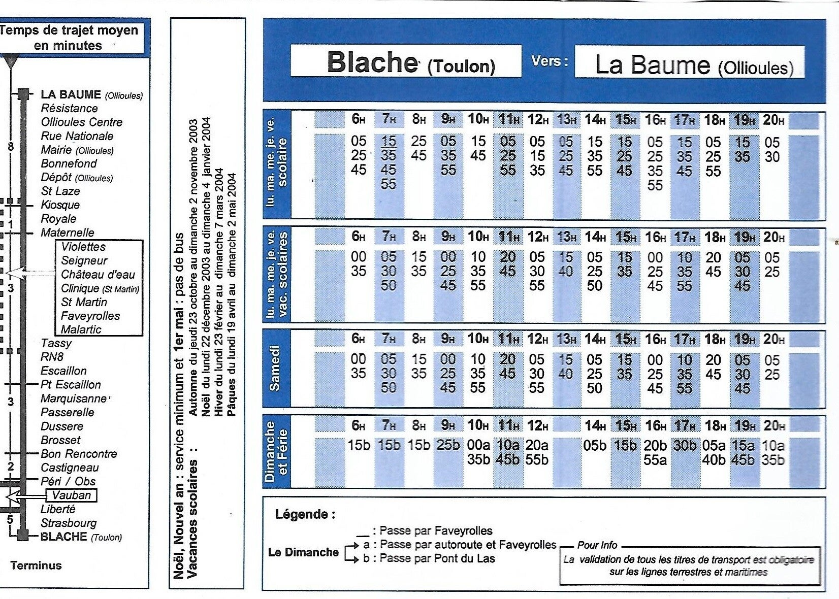 Jusqu’au 30 aout 2010, la ligne circule alors sur son itinéraire historique entre Toulon & Ollioules. A cette date, la ligne fusionne avec la ligne 128 et est prolongée à La Seyne sur Mer, à l’arrêt La Seyne Présentation du lundi au samedi. Le dimanche, la ligne circule sur le trajet Blache <> La Baume.