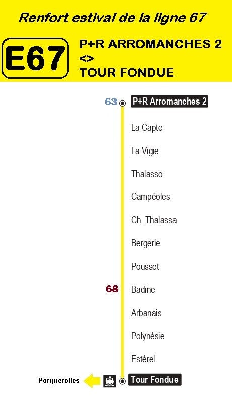 Depuis l’été 2024, une petite nouvelle fait son arrivée pour renforcer la 67 surchargée. Il s’agit de la ligne E67 (Estivale 67) qui circule en juillet & août de 09h40 à 18h35 entre le P+R Arromanches 2 et Tour Fondue. Ce terminus permets aux automobilistes de laisser leur voiture au parking pour finir en bus.