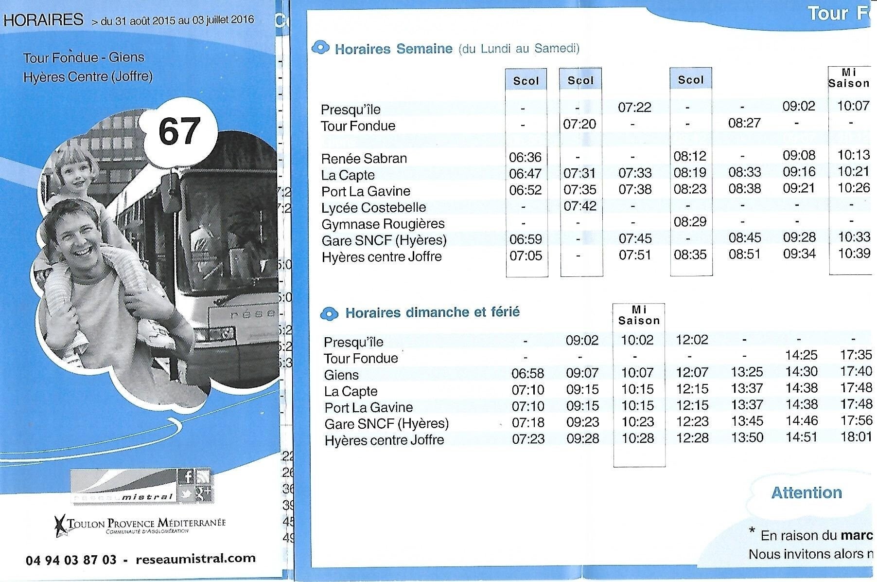 La ligne 67 fait partie des lignes de « l’ancien réseau hyérois » qui a intégré le réseau mistral en 2002.