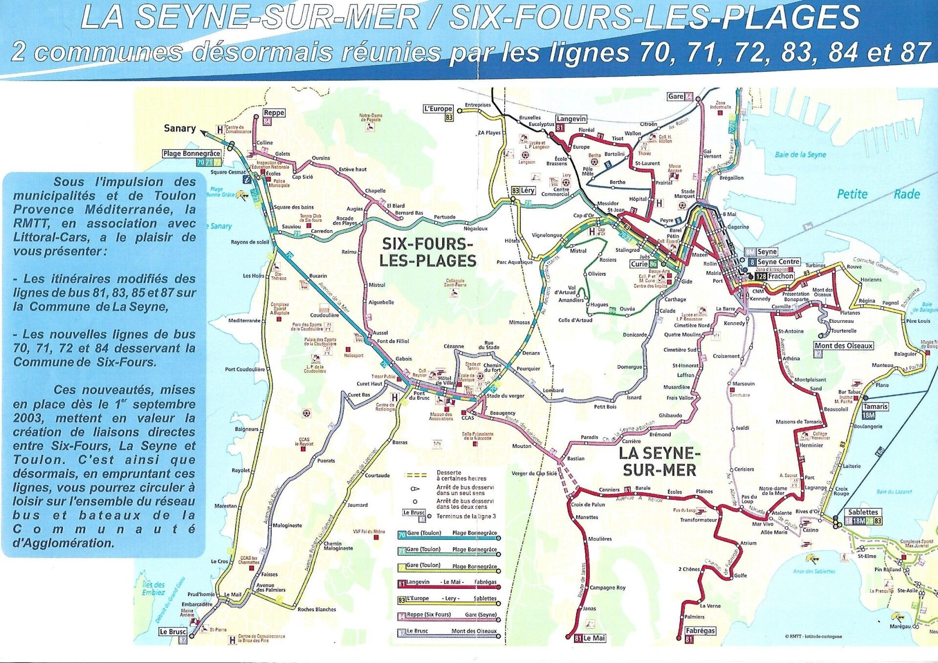 Elle sera sous forme d’antennes à 2 branches. L’une vers Seyne Centre (Lycée Beaussier) et l’autre vers les Sablettes. Son trajet dans Six Fours sera également modifié pour assurer la desserte du Collège Font de Fillol.