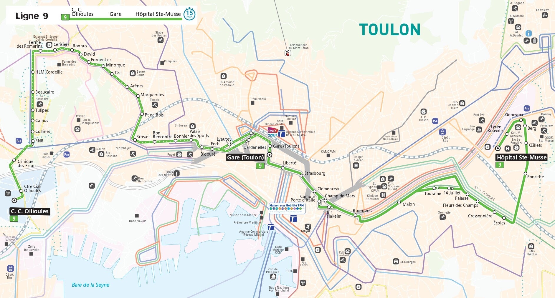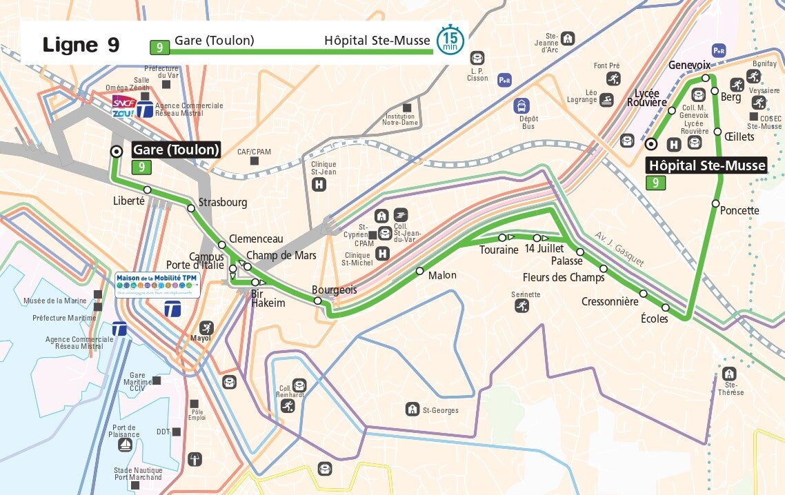 La ligne emprunte la rue jusqu’au rond-point de Ste Musse en desservant les arrêts Lycée Rouvière (ancien arrêt Curette) et Genevoix.