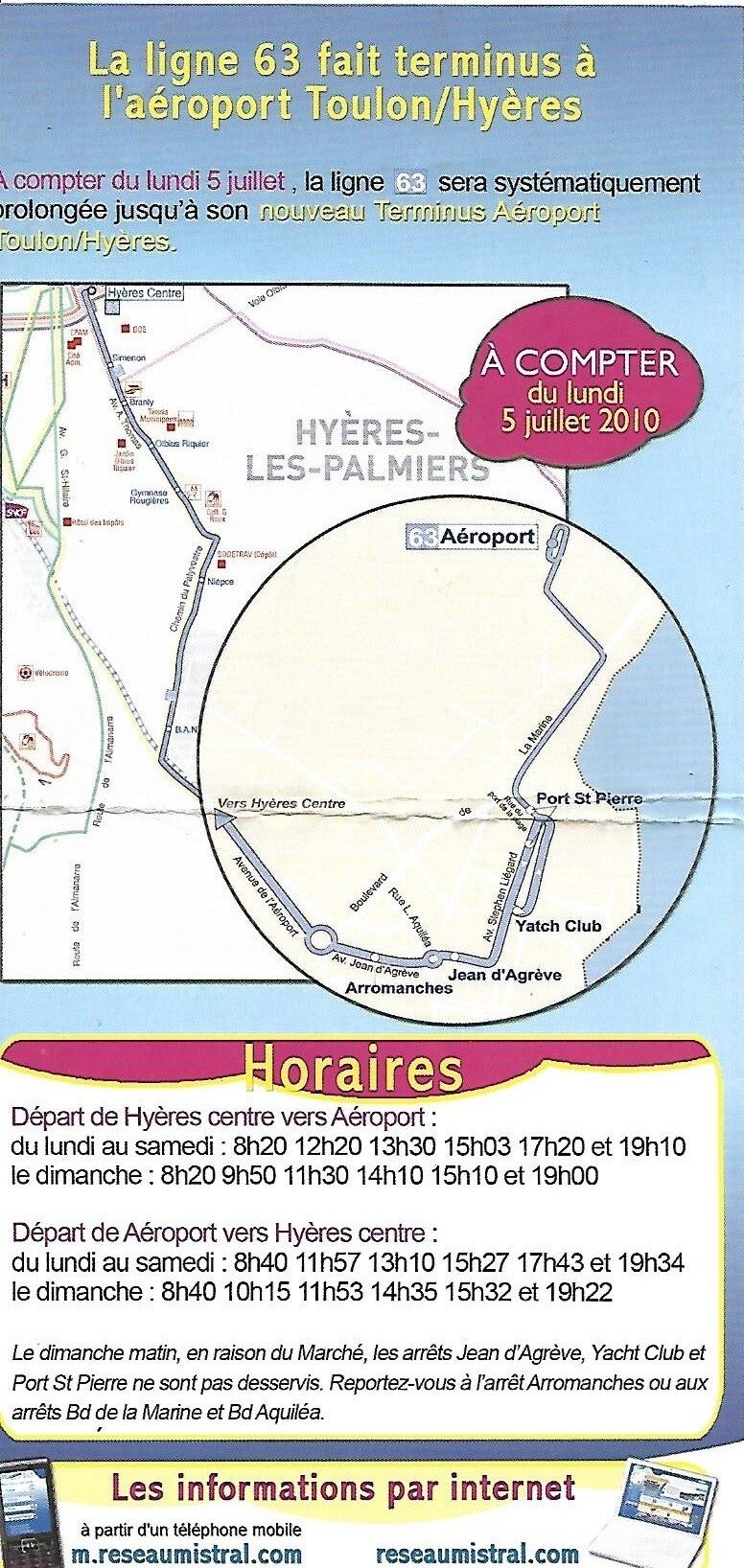 Entre l’Aéroport & le centre-ville d’Hyères, la ligne 63 reste inchangée, ensuite elle file vers les salins par la ligne 66 et est prolongée jusqu’à Moulin Premier via le prolongement de cette dernière ligne jusqu’à Capricorne puis rejoint son nouveau terminus via la RD559A.
