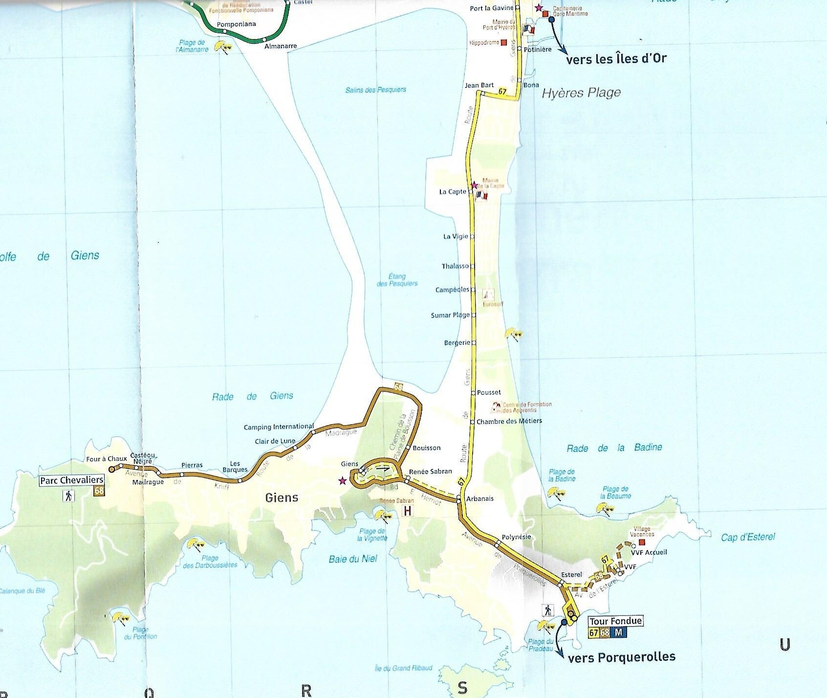 Notre navette file à droite sur le Boulevard Edouard Herriot puis la Place Raymonencq pour desservir le cœur de Giens.