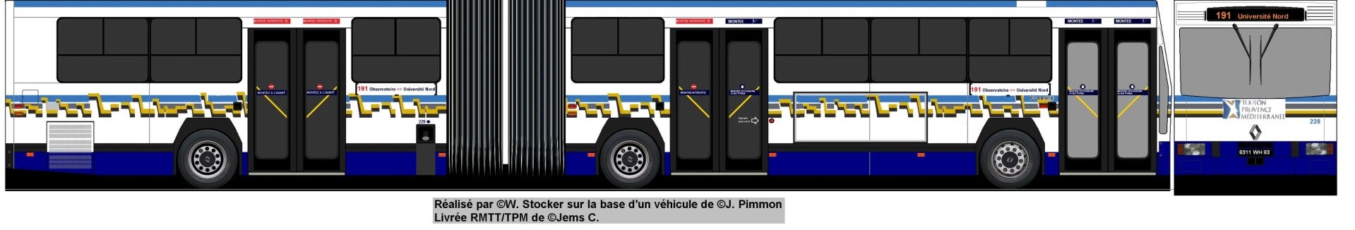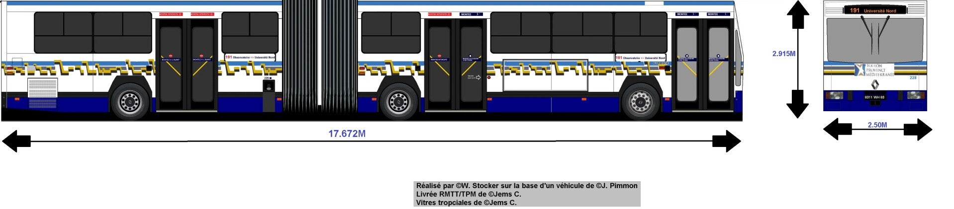 Ses mensurations sont classiques pour un bus de ce gabarit avec ses 17,672m de long, ses 2.50m de large et sa hauteur de 2.915m.